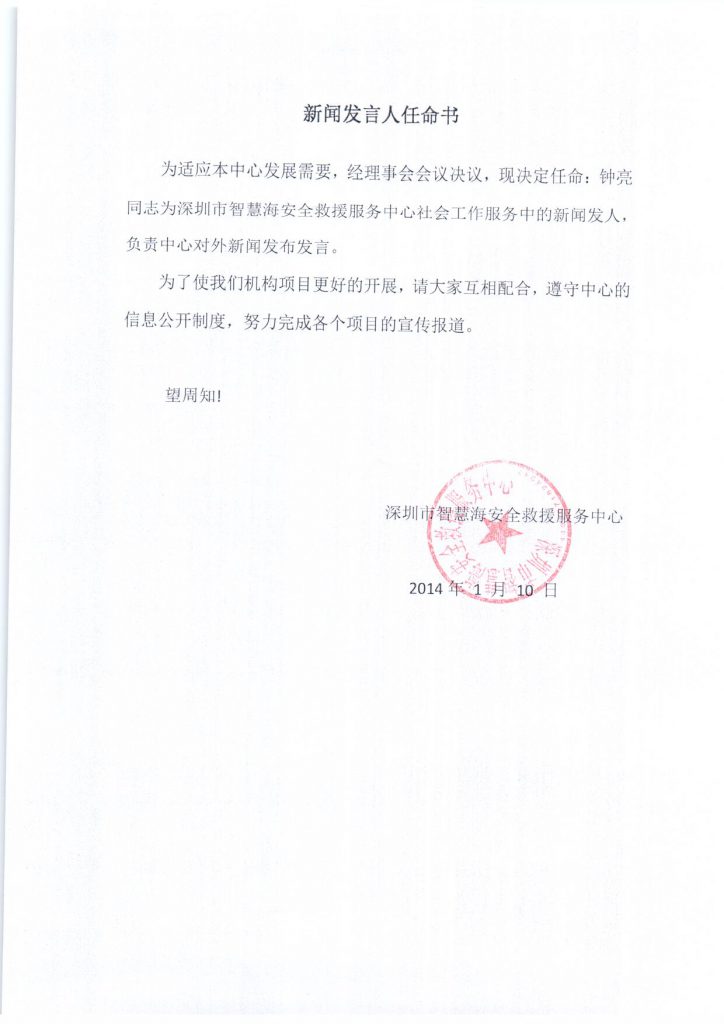 深圳市智慧海安全救援服务中心新闻发言人任命