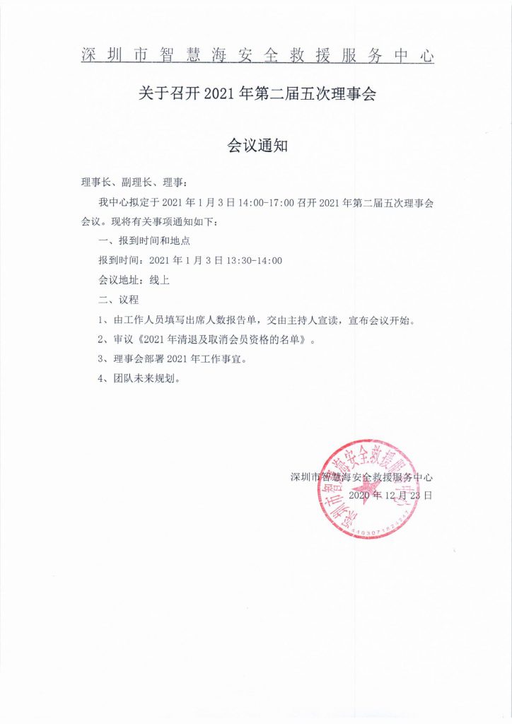 深圳市智慧海安全救援服务中心第二届五次理事会会议通知