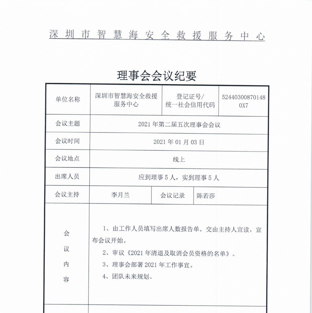 深圳市智慧海安全救援服务中心第二届五次理事会会议纪要
