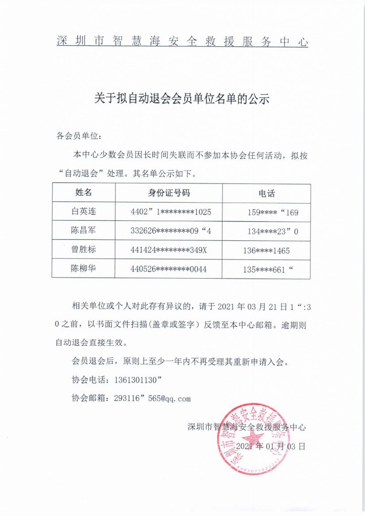 深圳市智慧海安全救援服务中心关于拟自动退会名单公示