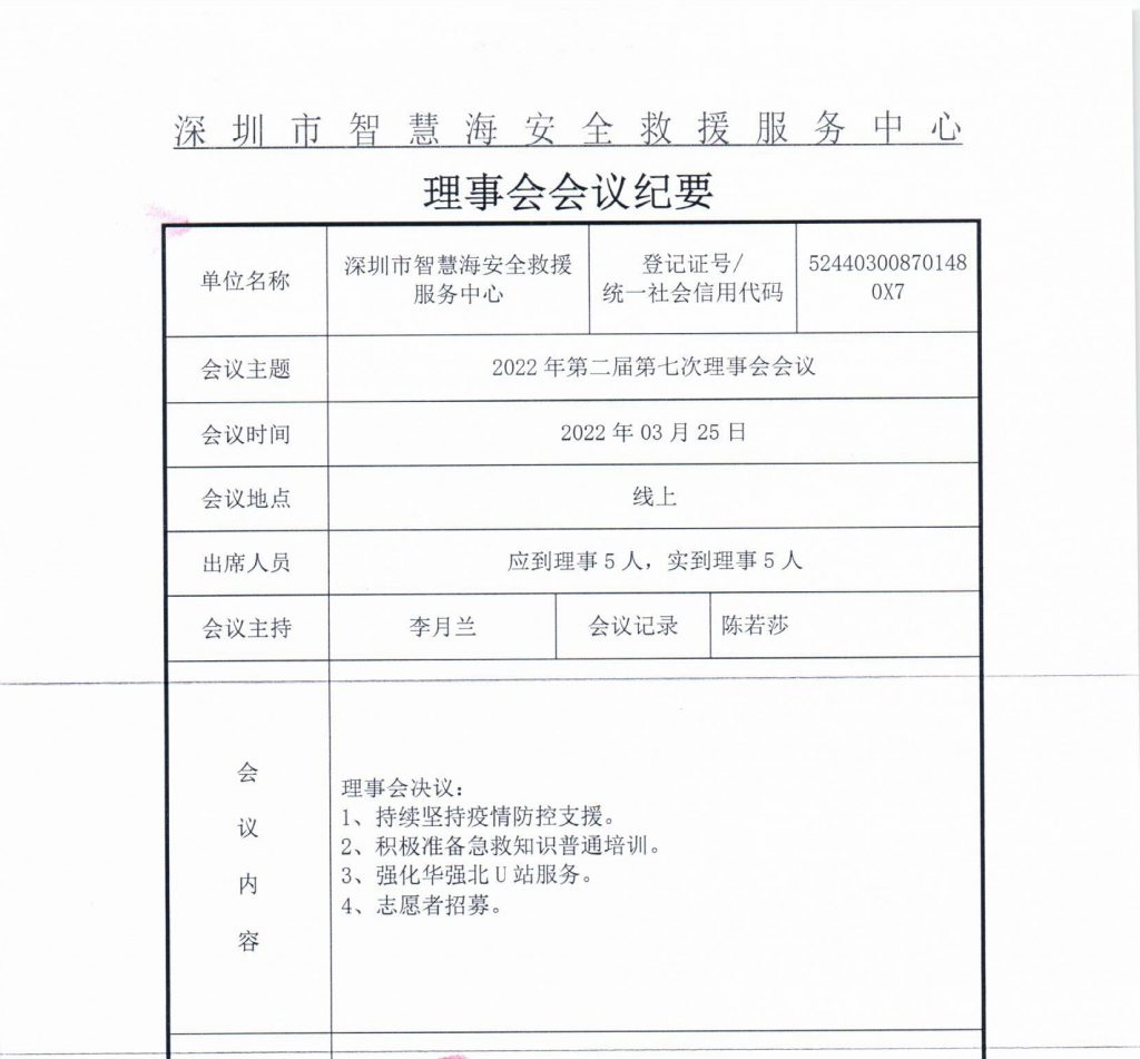 深圳市智慧海安全救援服务中心第二届七次理事会会议纪要