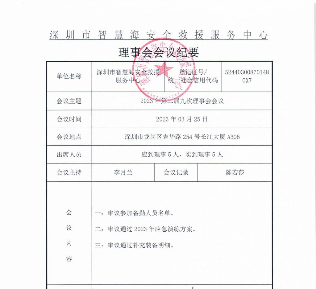 深圳市智慧海安全救援服务中心第二届九次理事会会议纪要