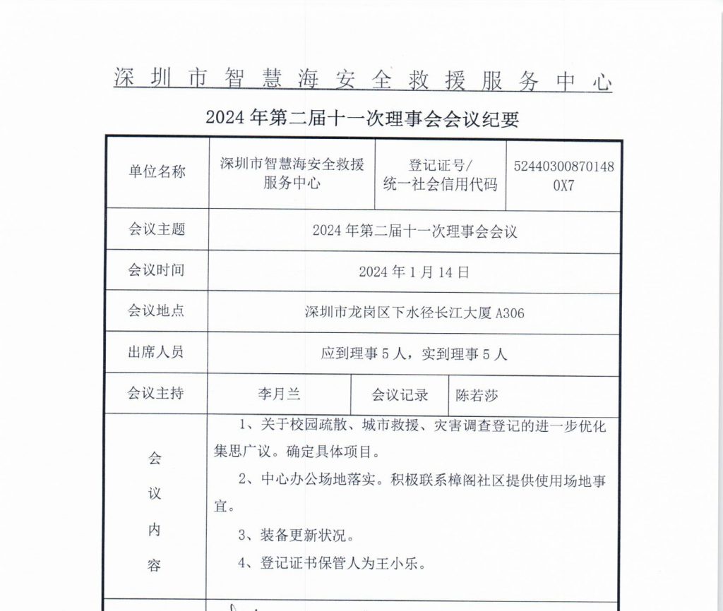 深圳市智慧海安全救援服务中心第二届十一次理事会会议纪要