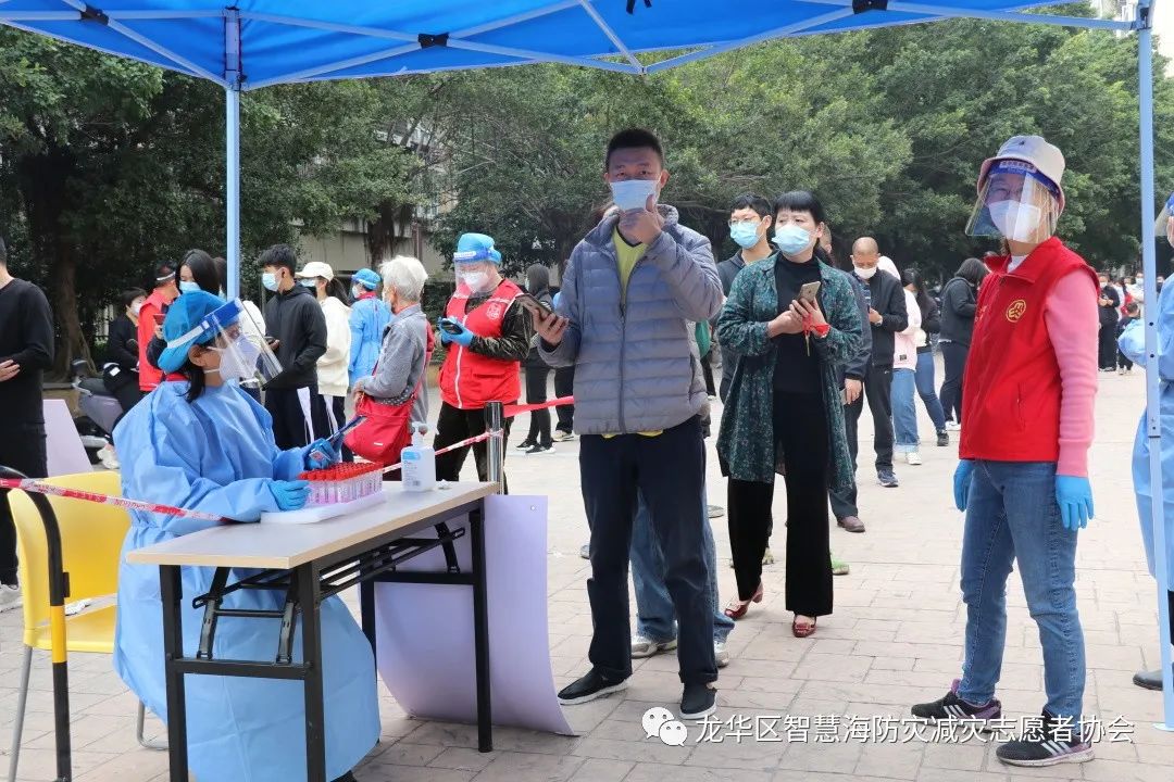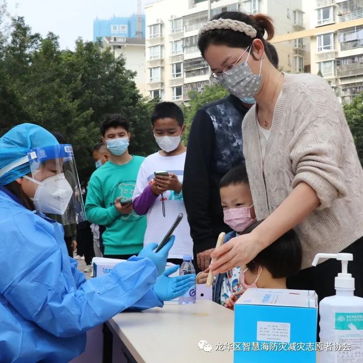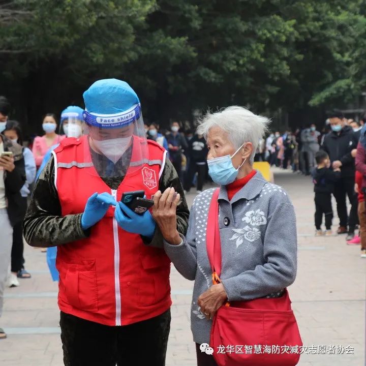 在各个核酸点,都能看到智慧海救援队队员的身影,他们为群众指引,指导群众提前打开二维码,对老人等特殊人群提供特殊帮助。