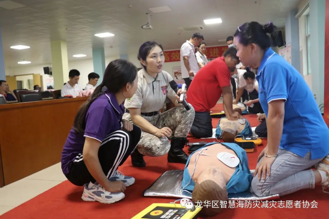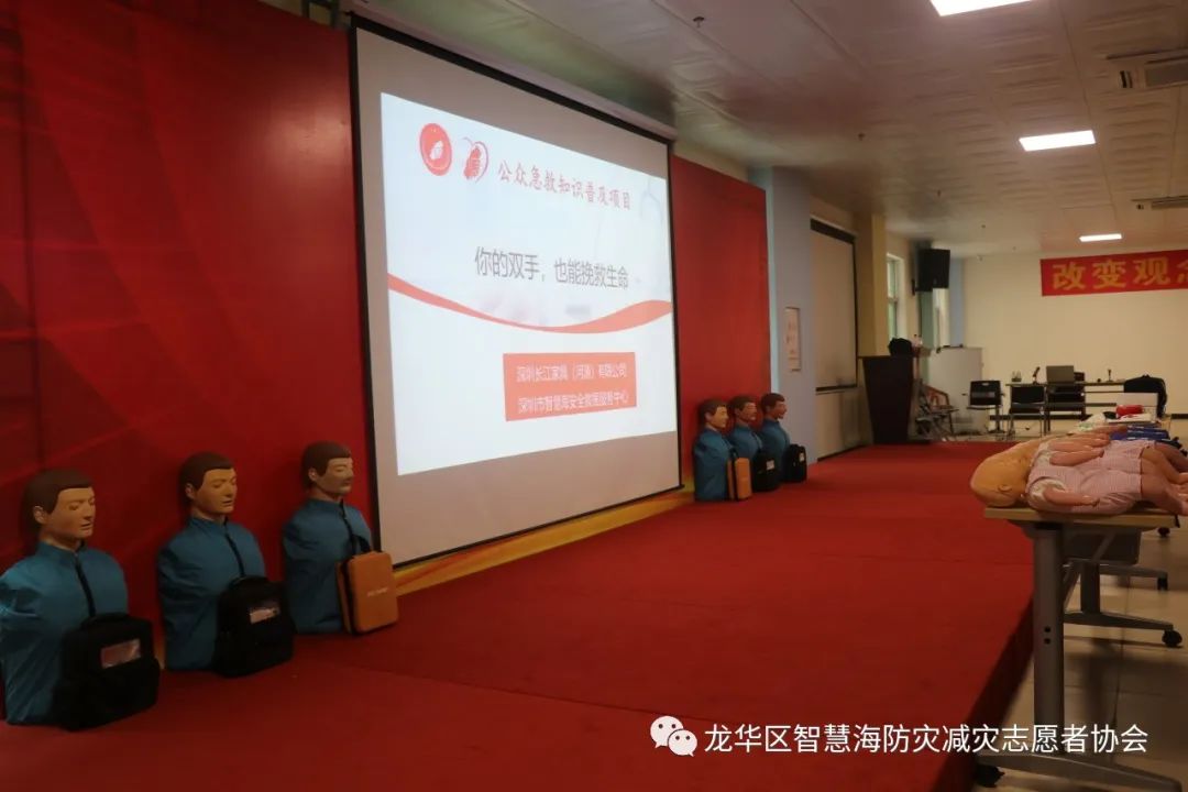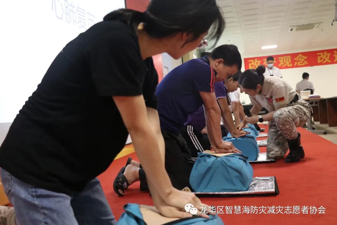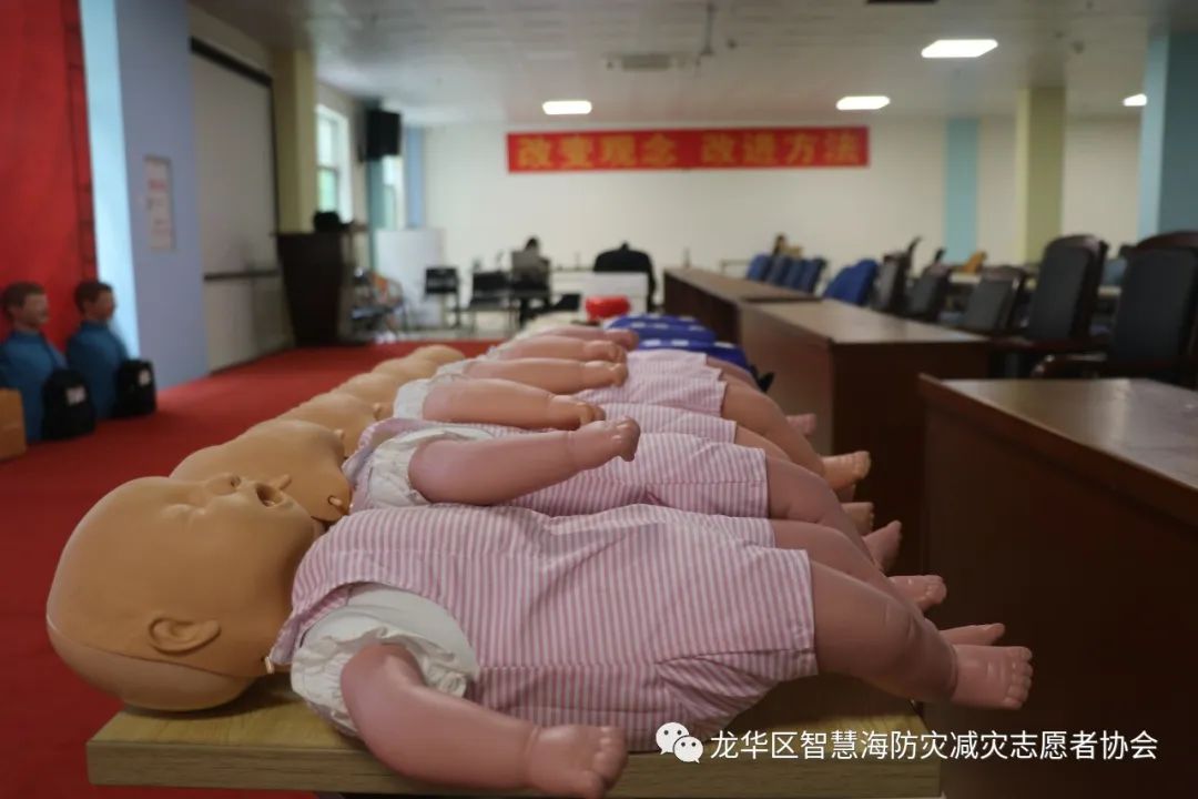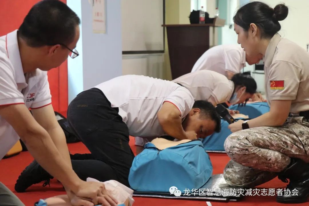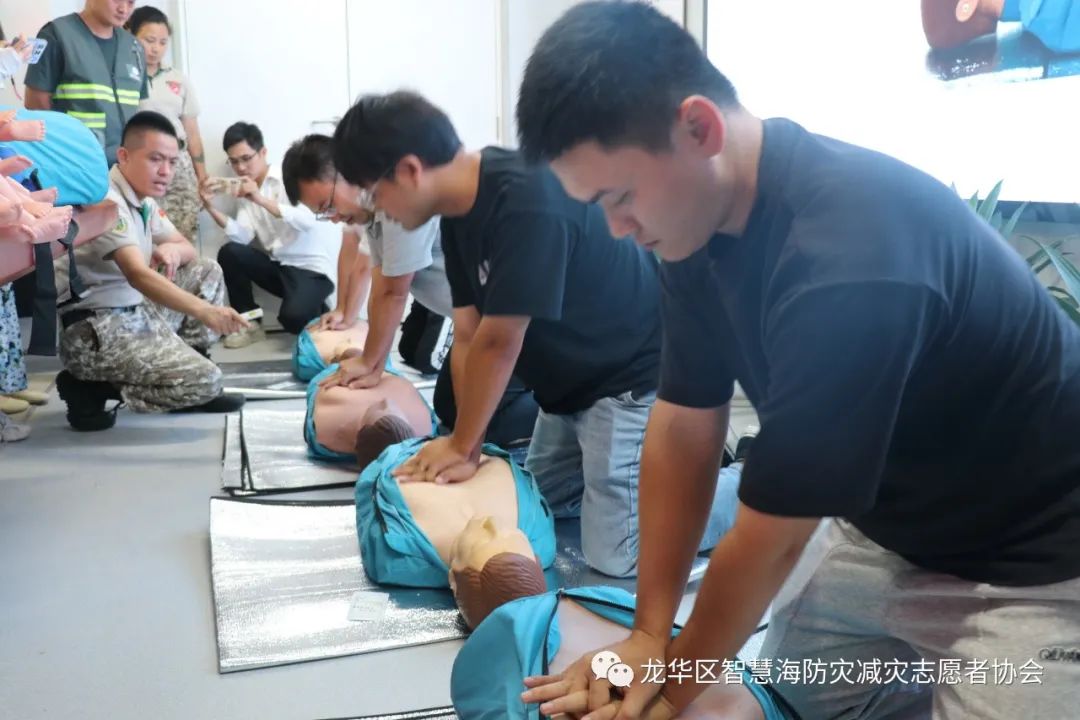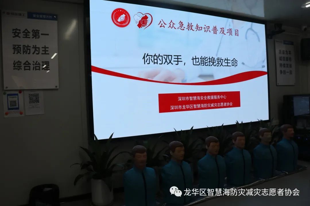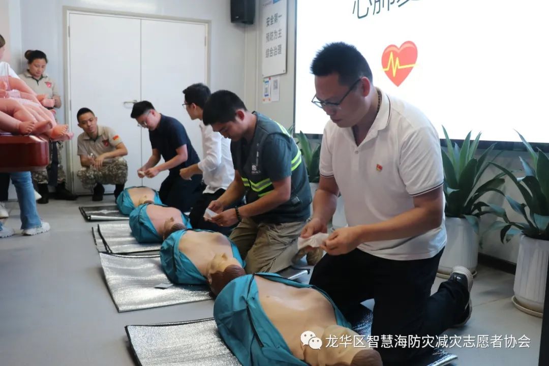 为了让企业高管能在实操中加深理论知识的印象,能真切感受急救动作的力度和位置,智慧海救援队的队员们带着人体模型、AED等教具来到培训现场。