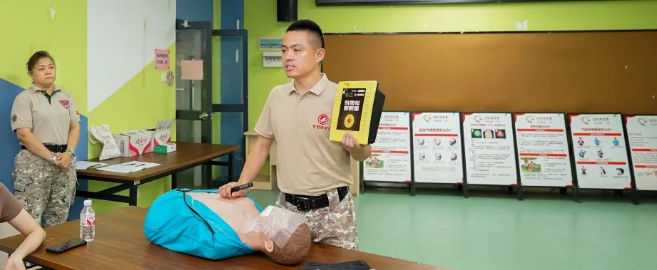 在讲解AED仪器时,讲师先介绍了机器的运作原理,再借助教具,将每个按键的用途展开清晰讲解。